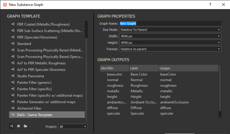 Next time you run your Substance and choose new substance, on the left hand side you'll see graph templates and if you scroll all the way down, you'll see DeGi - Game Template.